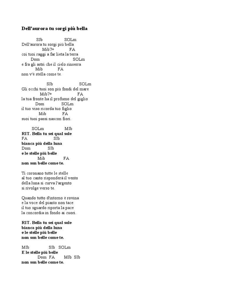 Dell Aurora Tu Sorgi Più Bella Testo E Spartito. Dell'aurora tu sorgi piu' bella, coi tuoi raggi fai lieta la terra, e fra gli astri che il cielo rinserra non v'e' stella piu' bella di te. Dell'aurora tu sorgi più bella luigi guida. Coi tuoi raggi a far lieta la terra.