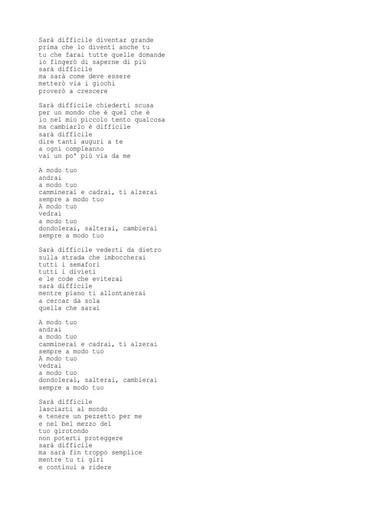 A modo tuo andrai a modo tuo camminerai e cadrai, ti alzerai sempre a modo tuo a modo tuo vedrai a modo tuo dondolerai, salterai, canterai sempre a modo tuo. Sarà difficile diventar grande prima che lo diventi anche tu tu che farai tutte quelle domande io fingerò di saperne di più. Sarà difficile diventar grande prima che lo diventi anche tu tu che farai tutte quelle domande io fi. Bm g d camminerai e cadrai, ti alzerai sempre a modo tuo.