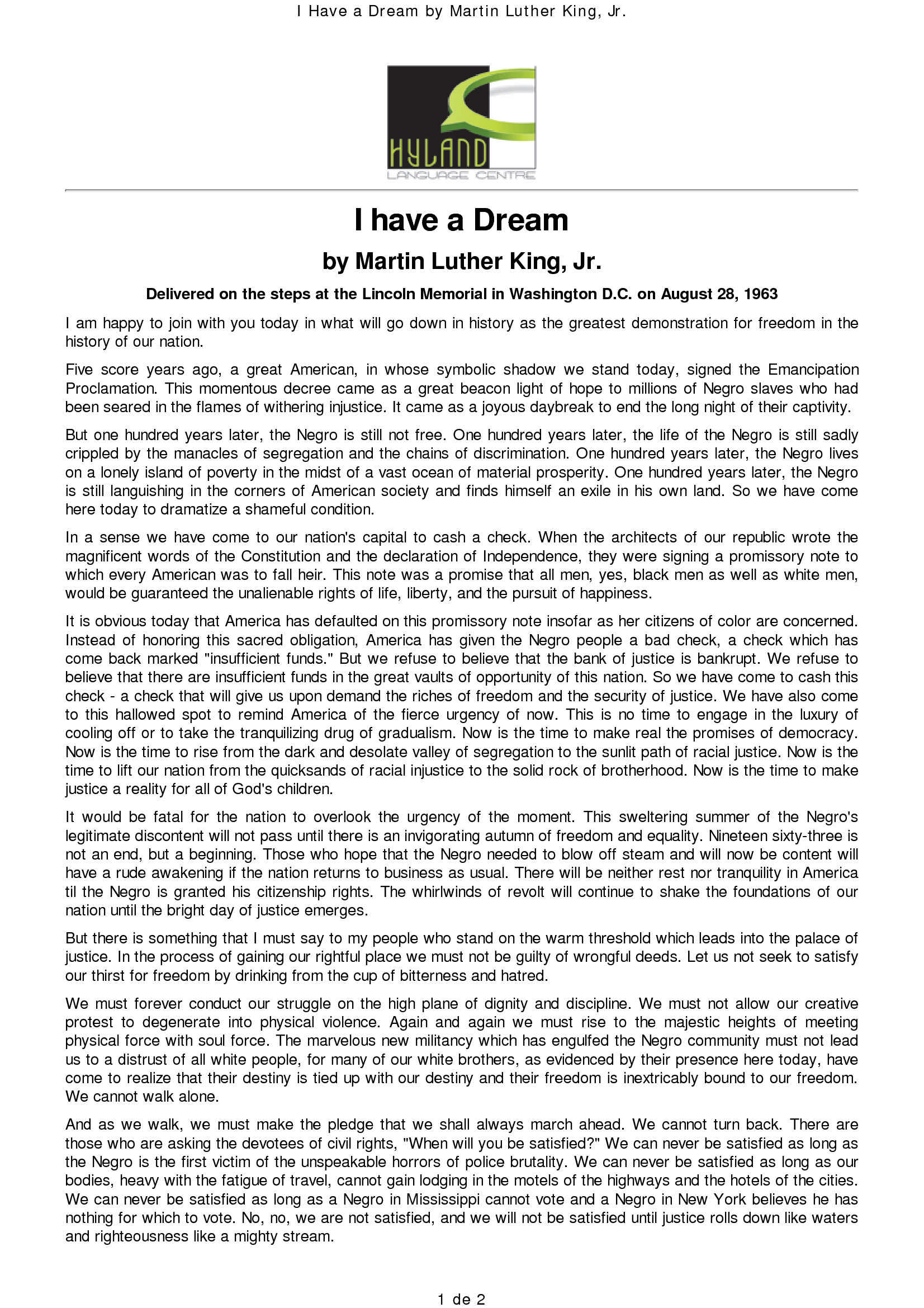E anche se dovrete affrontare le difficoltà di oggi e di domani, io ho ancora un sogno. This lesson plan will help your students understand how important he was and help them dream as he did. That his dream is that all people will be treated equally, and that dream is directly related to the american. I have a dream is a public speech that was delivered by american civil rights activist martin luther king jr. Played a big role in shaping america into the country that it is today.