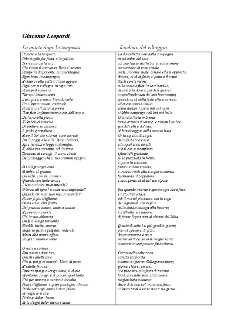 La piazza del sabato del villaggio a recanati è proprio quella che fa da sfondo ai celebri versi del poeta giacomo leopardi: Un mazzolin di rose e viole, onde, siccome suole4, ornare ella si appresta. Nella prima parte del testo sono centrali le immagini della donzelletta e della vecchierella. Introduzione ed accenni di confronto scritto subito dopo la quiete dopo la tempesta il testo ne riprende il tema all'inizio del canto c'è la successione di quadri di vita paesana ed in particolare del sabato, quando viene fuori una movimentata immagine del villaggio. Study these flash cards | study italian flash cards.