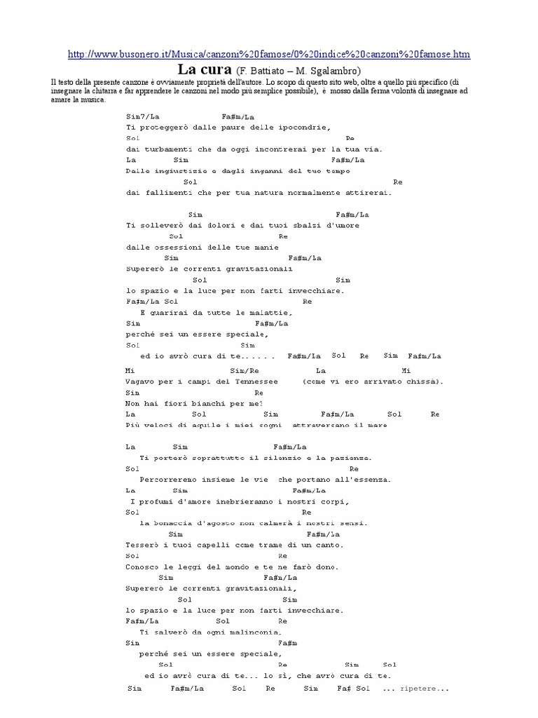Il Testo Della Canzone La Cura. Dalle ingiustizie e dagli inganni del tuo tempo, dai fallimenti che per tua natura normalmente attirerai. Testi musicali ♬ testi canzoni, anteprime discografiche, notizie, video e recensioni musicali. Franco battiato (francesco battiato ).