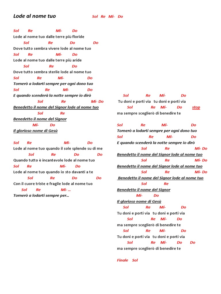 Lode al nome tuo nella terra più arida dove tutto sembra immobile lode al nome tuo. Quali sono le parole, le note musicali, le melodie e in generale i testi che ti accompagnano nell'arco della giornata facendoti provare emozioni e che ti stimolano ad affrontare con determinazione nuove esperienze di. Adesso però non hai più nulla di cui preoccuparti: Qui sotto potete trovare anche il testo con gli accordi !!!