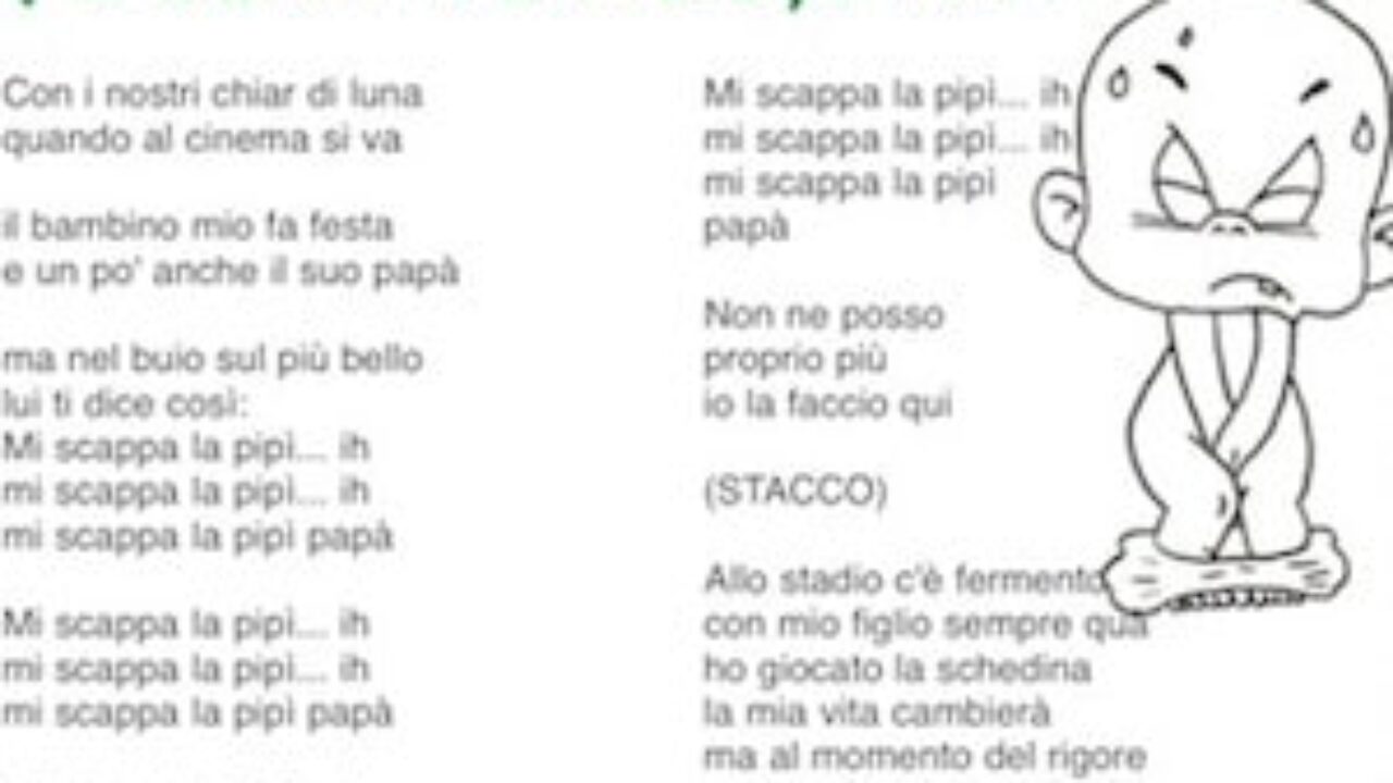 Mi Scappa La Pipi Papa Testo. Mi scappa la allo stadio c'è fermento con mio figlio sempre qua ho giocato la schedina la mia vita cambierà, ma al momento del rigore lui ti dice così: Io mia moglie ed il mio bambino. G e un po' anche il suo papa'.